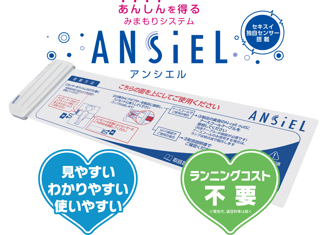 | 概要 | ANSIELは、セキスイ独自開発の圧電センサーを搭載した見守り支援システムです。 介護現場にとって必要十分な機能に絞った「使いやすい・わかりやすいセンサー」を目指して開発しました。「在床管理機能」「起上検知機能」「睡眠検知機能」を搭載しているので、スタッフ様の業務負担軽減に寄与することができ、生産性向上の推進を支援します。さらに、カメラとの連携もご選択いただけるようになりました。 また、導入時のハードルとなるコスト面においても、ランニングコスト不要・専用サーバーPC等不要としており、大変好評いただいております。 |