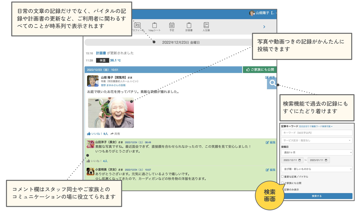 | 概要 | 「ケアコラボ」はご利用者にかかわる記録を集約・共有することで、支援に関わるすべての人をつなげ、もっといいケアのかたちを育むことをサポートする支援記録システムです。 シンプルな画面で誰でもかんたんに操作できるので、業務効率化と記録の質向上を同時に実現できます。最初の2か月間は利用料無料・契約期間しばりなしの安心設計です。 |